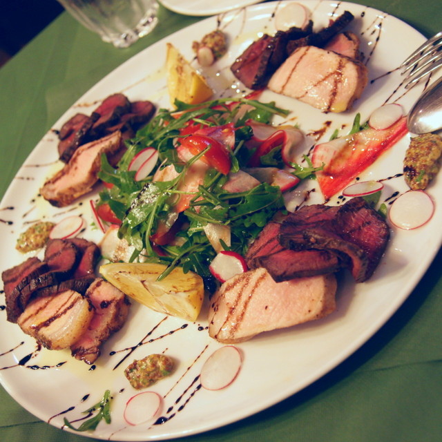 ・埼玉産岸さん豚ロースの塩麴でマリネした香草グリル&北海道サロベツ産熟成エゾジカのタリアータ バルサミコソース