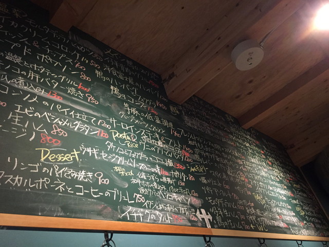 メニューは、背面の黒板にずらりと、前菜からメイン、デザートにいたるまで書かれています。