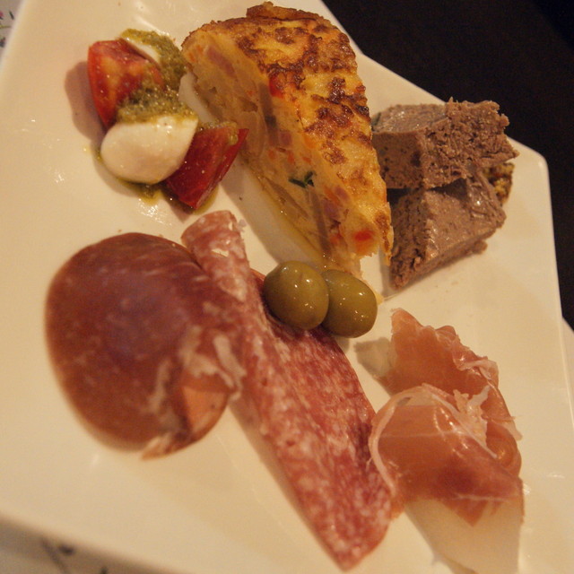 コッパ・生サラミ・生ハム梨・地鶏のテリーヌ・スパニッシュオムレツ・カプレーゼと盛りだくさんの前菜です。お店の前菜の目玉商品をひと口ずついただいたかのような盛り合わせですね。生ハムを旬の梨と合わせるのはおもしろいですし、コッパの熟成感もいいですね。素材はどれもいいものが揃えてあるのがわかります。テリーヌは、鶏とのことですが、肉の旨みもしっかりしている味わいで驚きです。