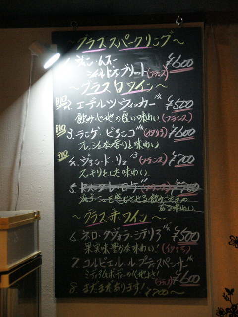 メニューは、グラスワインが赤・白ともに500円~、スパークリングは600円です。料理はワインバーですが、品数は厳選されているものの、軽いものからしっかりとした食事までありますね。