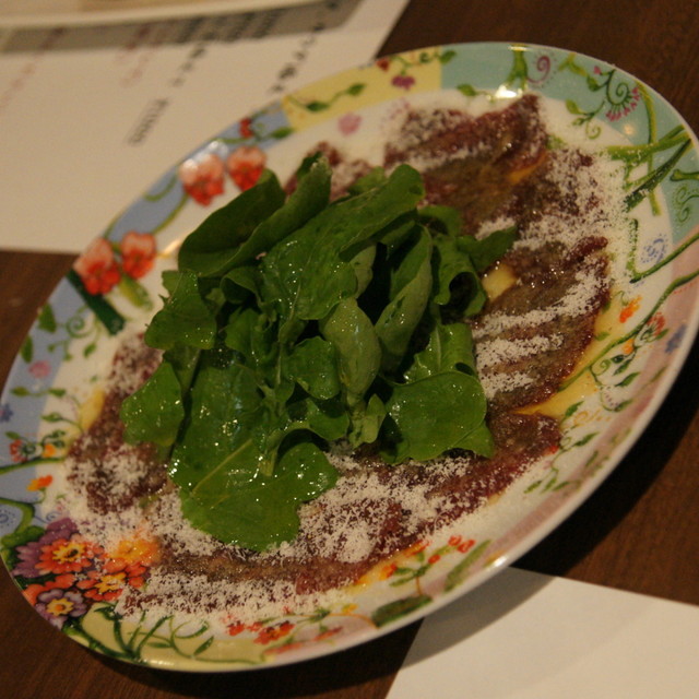 ■青森小田桐牧場直送、馬肉のカルパッチョルッコラとチーズと一緒に(1,100円)