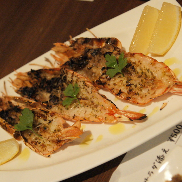 赤座エビの香草網焼き、レモンを添えて(2尾800円)2016年10月