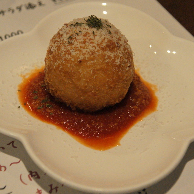 赤身の馬刺しにたっぷりとチーズを振りかけ、ルッコラとともに盛られています。馬刺しの赤身の味わいもいいですが、それにルッコラの個性が加わると薬味のようないい働きをしてくれて、複雑な味わいになりますね。