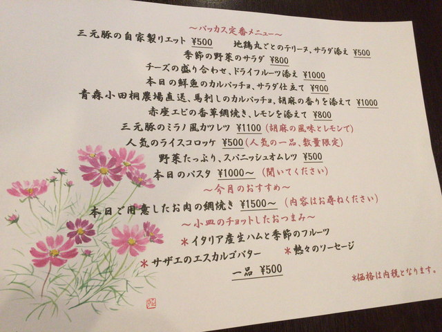 500円の軽いおつまみでワインを楽しむもよし、パスタ(1,000円~)や本日ご用意したお肉の網焼き(1,500円~)などを頼めば、ファミリーでも楽しめるお店ですね。