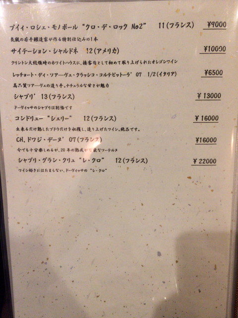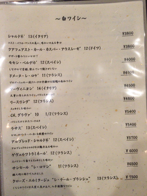 ボトルで8,000円ですが、酒屋の実売価格で6,000円弱なので、お店で飲む価格としては非常に安いですね。ワインバーなので当然ながらこだわりの仕入れですが、このぐらいの価格帯のところが最もお得感のある価格構成になっているかと思います。逆に言えば、ご主人が飲んでもらいたいワインがこのぐらいの価格なんでしょうね。