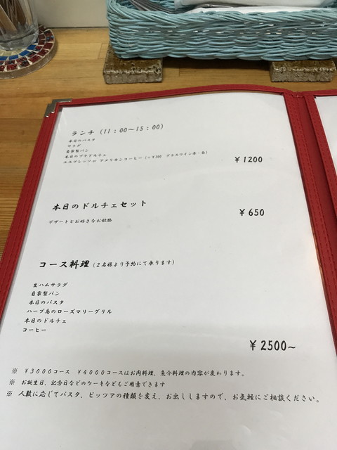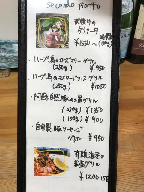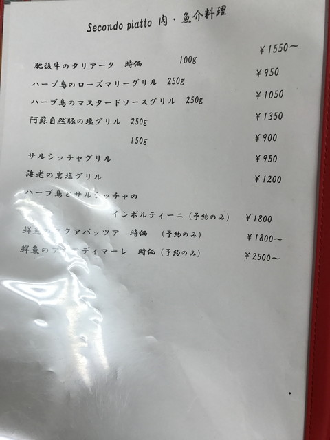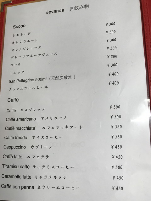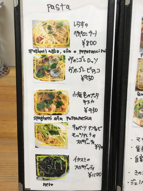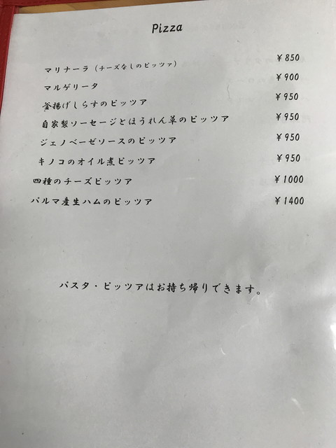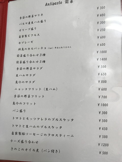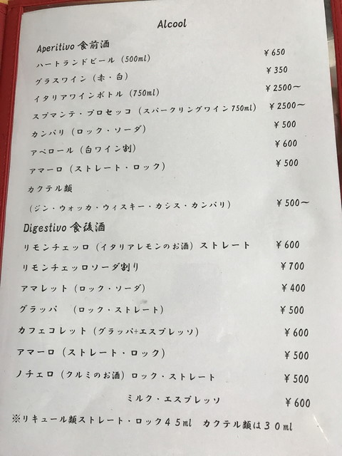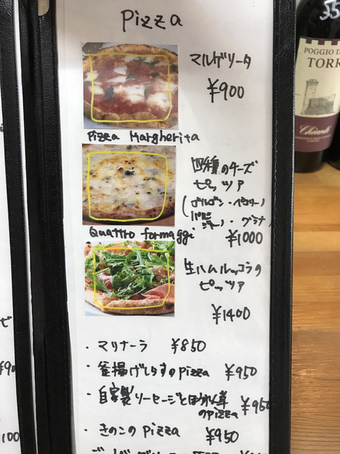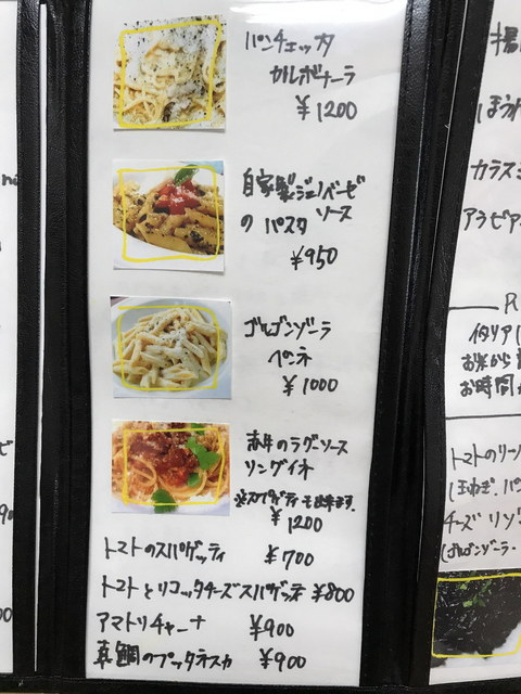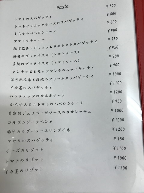 メニューは、パスタ・リゾット・ピッツァが多いですが、前菜からメインまでバランスよく用意されています。前菜は1皿500円程度が主力の価格帯、パスタやピッツァは1,000円程度です。飲み物は、ワインのボトルが2,500円~とリーズナブルな価格ですね。