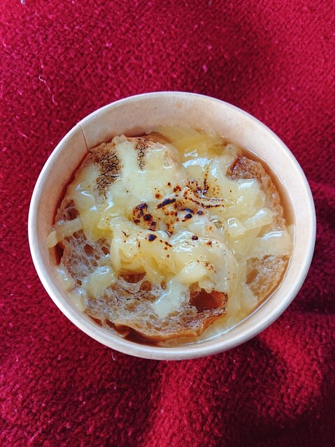 プティルッソ」さんのキッチンカーもあってびっくり。この時はリゾット、チュロスやポテトを売っておられました。寒かったのでオニオングラタンスープを買って、sotokoさんのお弁当と一緒に車内でいただきました。