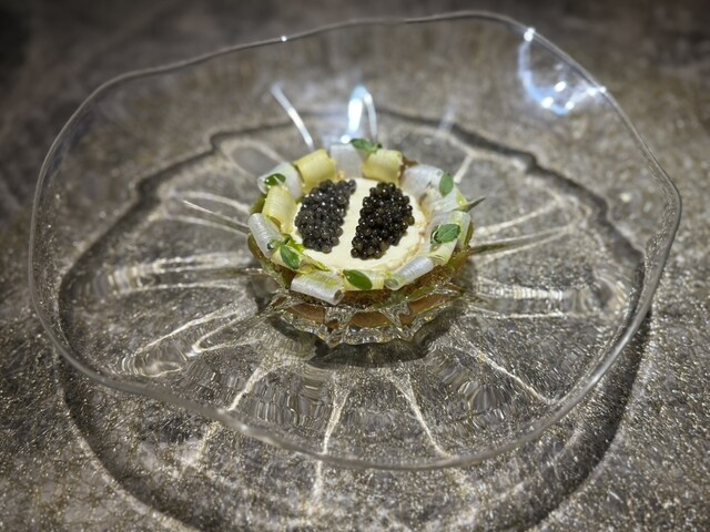 次に、ホワイトアスパラ(香川県産)にキャビアを合わせたサラダ仕立て。下にはムース、上には甲殻類のジュレ。ほんのり春野菜の苦味もあって、エストラゴンの香りがアクセント。
