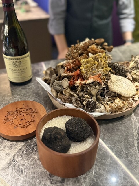 ブルゴーニュのピノ・ノワールとともに、国産のキノコ25種類を使った一皿。黒トリュフをたっぷりのせたロワイヤル、キノコのコンソメ、キノコピューレが真ん中にあり、食感が楽しい。茶碗蒸しのような滑らかさと、トリュフの香りが広がる。旨みがじんわり染み渡る。これもまた贅沢