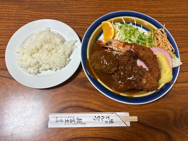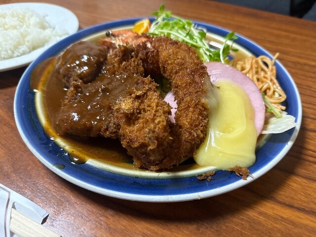 Aセットのボリュームがすごかったけど、デミグラスソースがマイルドでとんかつにもエビフライにもハンバーグに合うように作られていて、箸がとまりませんでした〜