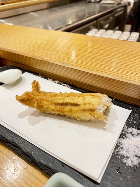 帆立は磯辺焼き風に海苔に挟んで頂きます。天ぷらの磯辺焼きは初めてで、普通に焼いて挟むのとは違った食感を楽しめました。
