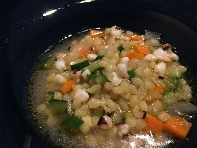お昼のパスタは、色んな麺のカタチとソースがあって楽しかったです。麺はもっちりしていて、具材とソースが麺と一体になってて、麺を噛むと、旨味がじわりと口の中に広がる。地ダコのラグーとワカメとトマトのソースにリングイネが合わさった料理は、地元淡路島の食材のみで出来てて、新鮮で美味い。