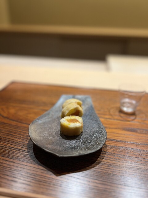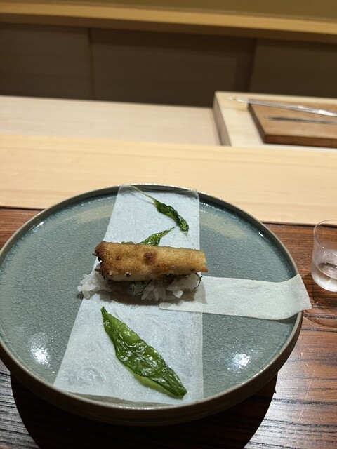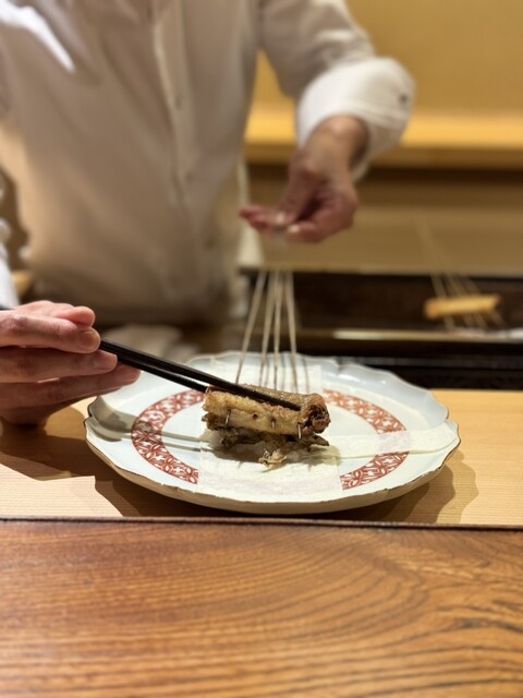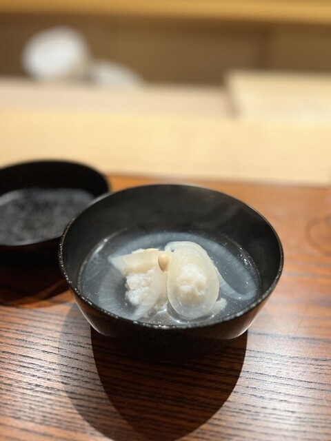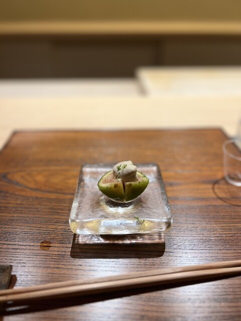 一品目でまず心を鷲掴みにされます。それがこの数種のシメジと原木椎茸を水だけで煮出したスープ。水だけとは思えない深くて繊細なスープは胃に沁み渡るようでスタートとしては完璧です。次は鳥取からの香箱蟹の饅頭。小さいながら美しい姿と旨みの詰まった饅頭は傍らに添えられたリンゴと生姜の付け合わせと相性が抜群です。3品目はお造り。こちらのシグネーチャー的な調味料と共に食す蛸とヒラメは素材は勿論のこと、決め手になる調味料がいかに大事かが再認識させられる。お椀は舞茸とクエだったか。こちらも品のいいお味でよきよき。次のシマアジは細かく包丁を入れた鯵の皮目に藁で火を入れ皮はパリパリで香り高いのに身はほぼ生に近い状態で、技術の高さを感じられるだけでなくとても美味しくて楽しい一品でした。お次は丹波の栗と枝豆を蒸した一品。栗は勿論のこと、枝豆が香り高く素晴らしかった。そして毎回楽しみな薄焼き卵で自分で巻いて完成させる巻き物は今回はメヒカリ。パリパリになるまで火を入れた骨とふっくらと揚げた身を1つに巻いて頬張る。至福の瞬間。