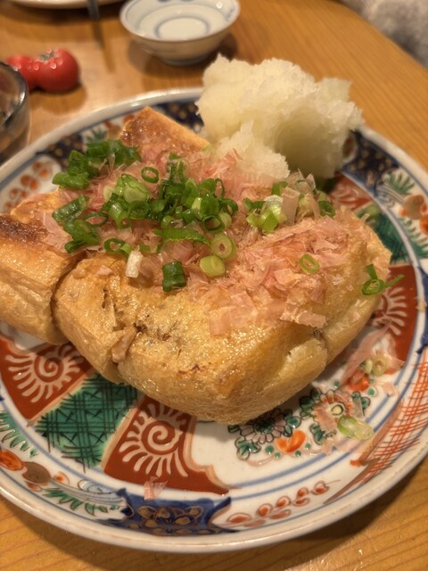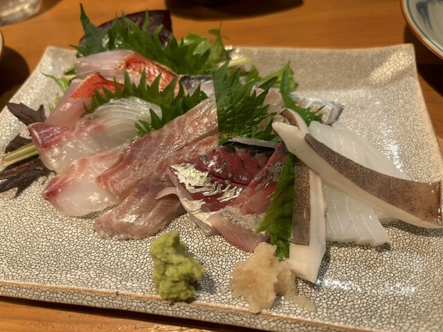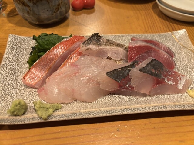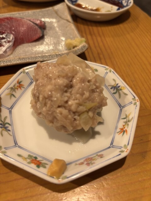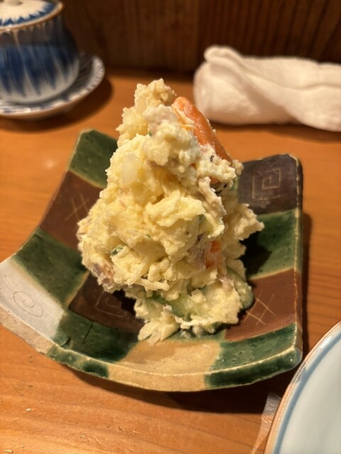 ポテサラ、栃尾の納豆挟み焼き、刺身は各種選んで2枚ずつオーダー、シューマイ、トリッパ、ピーマンの肉詰め、昆布おにぎり。