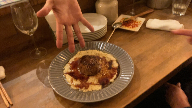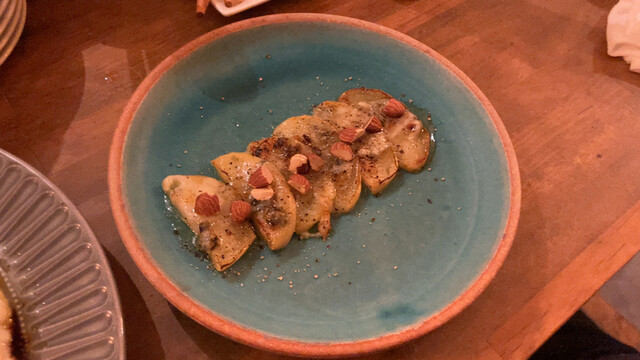 さて、さて、これは最近行った時の画像です。一時期メニューから無くなっていたチーズリゾットです。数年前だったかな?当時は、パルミジャーノの中で混ぜ混ぜして出していただいたことを、思い出しながら頂きます。うん、うまい!忙しくなければ、オリジナルのタパスも作っていただけますが、今は人もいないし忙しいのでなるべくご迷惑ならないようにしないとね! このリンゴのゴルゴンゾーラなんちゃらもワインには合いますね〜