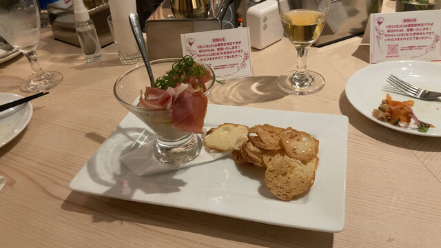 飲み物は、自分の好きな樽感、癖のある白を2種類ほどグラスでいただきましたが、安定の美味しさです。ボトルでの販売がないのは、品質を下げたくないのでそういう品物だとそれなりのお値段になってしまうからということみたいですが、私は一向に構いませんけどね。ただもう、量が飲めなくなってきたので、今となってはもうグラスで十分になってしまいましたが…