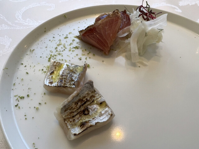 前菜は炙り太刀魚とイシガレイに包まれたシャインマスカット