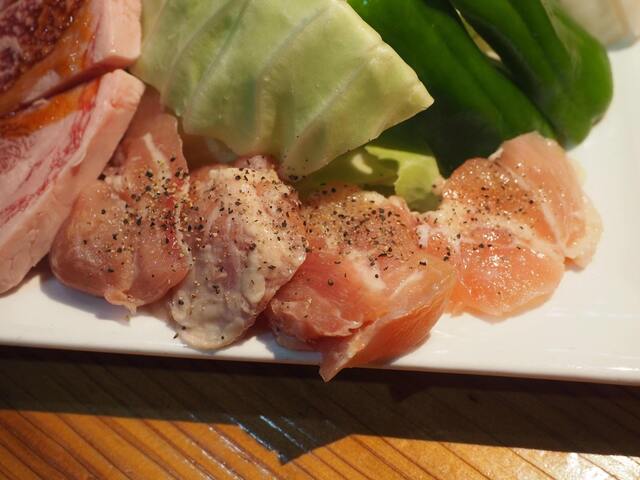セットは和牛ロース、ホルモン、野菜盛り、和牛カルビ、トリモモ、