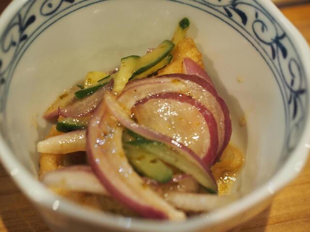 (付け出しのかまぼこときゅうりですが、かまぼこは豆腐が入っている