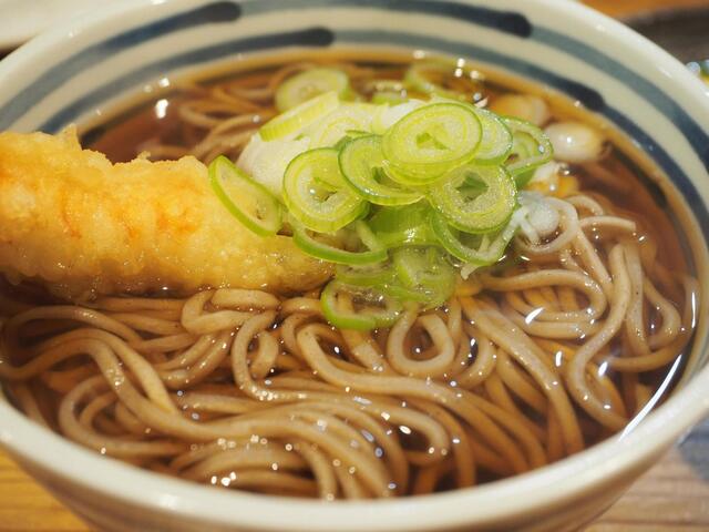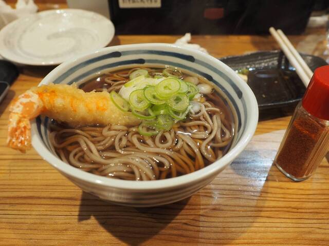最後のシメはエビ天そばです。そばは乾麺のようですが、だし他が