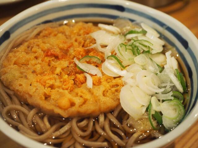 シメのそばはトッピングをかき揚げにしてもらいました。揚げたてで