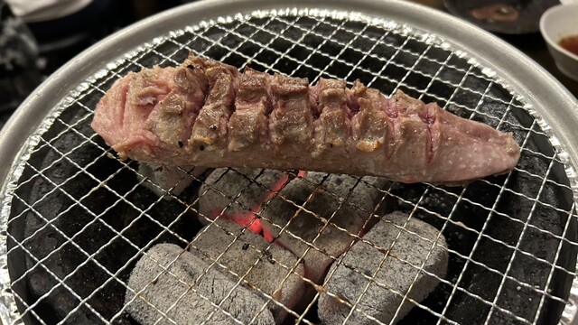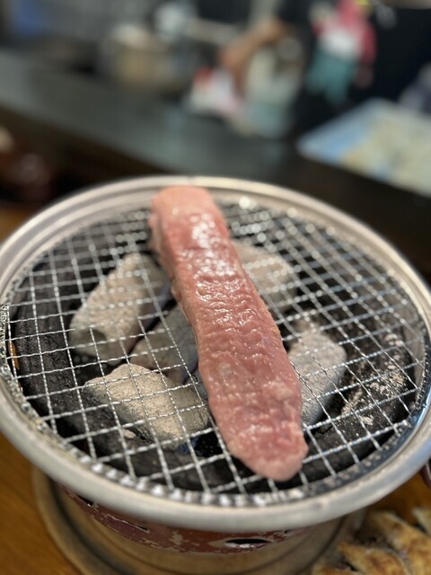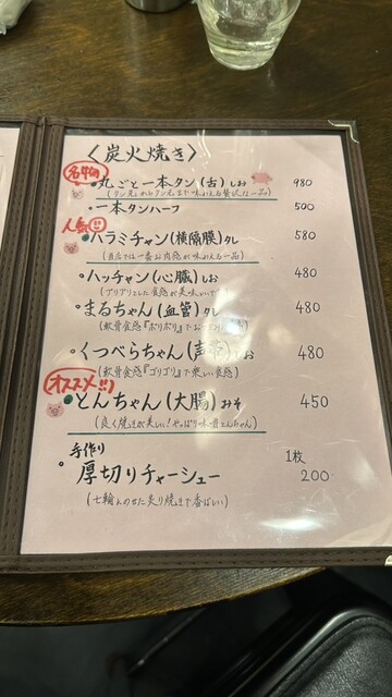 七輪で焼くとんちゃんも新鮮でうまい。一本タンはコリコリで塩がオススメ。ハッちゃん、レバちゃん、ハラミちゃん、マルちゃん、クツベラちゃんをいただきました。とにかく全部うまい。