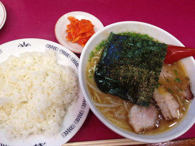 チャーシューが少し少な目のラーメンと、皿に盛られたライス
