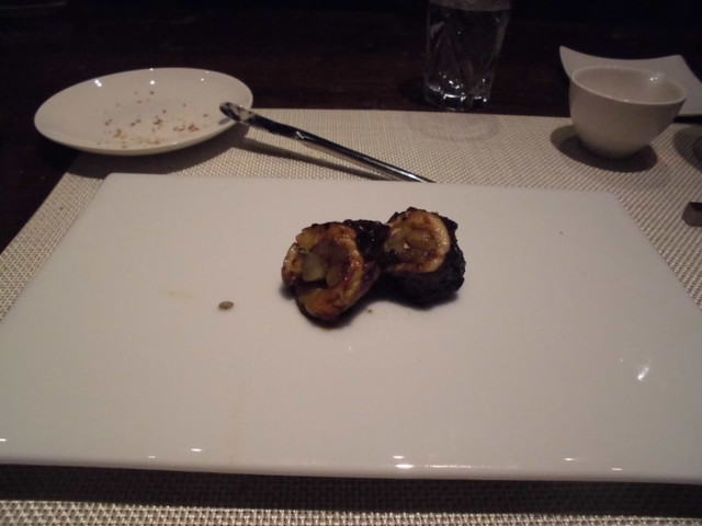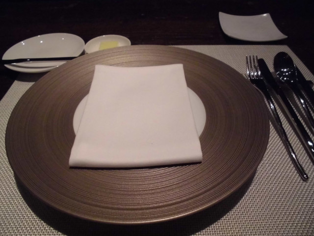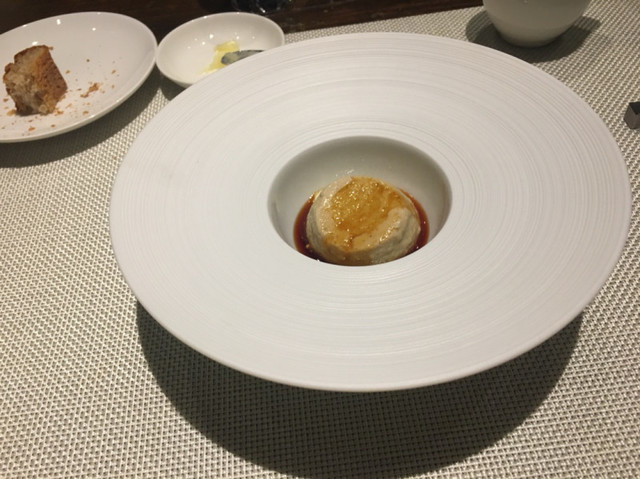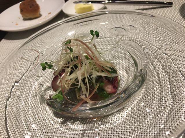 とうもろこしムースと生雲丹。トリュフ。。 なにこれ!(゜д゜)ウマー。。とうもろこしの自然な甘み雲丹の旨みそしてトリュフの香り♥しょっぱなからノックアウト。。 乾杯泡してます。。 シェフがおひとりでしてました。。最初頑固そうだな~と思ってΣ(・ω・;|||様子伺い。。意外にお若い方やった。。もっと年配と思ってたから勝手に。。 パンもいろいろな種類をだしてくれました。。写真撮り忘れ&ピンボケ。。