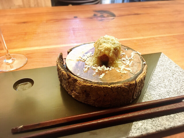 アミューズ。。始まり。。瞬間燻製されたグジェールは竹炭を練りこんでました。。