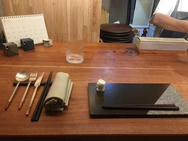 桜の木のカウンター幅が広いのでゆったりできました。。この水かけておしぼりになるタイプ最近よくみる(ˊ̱˂˃ˋ̱)