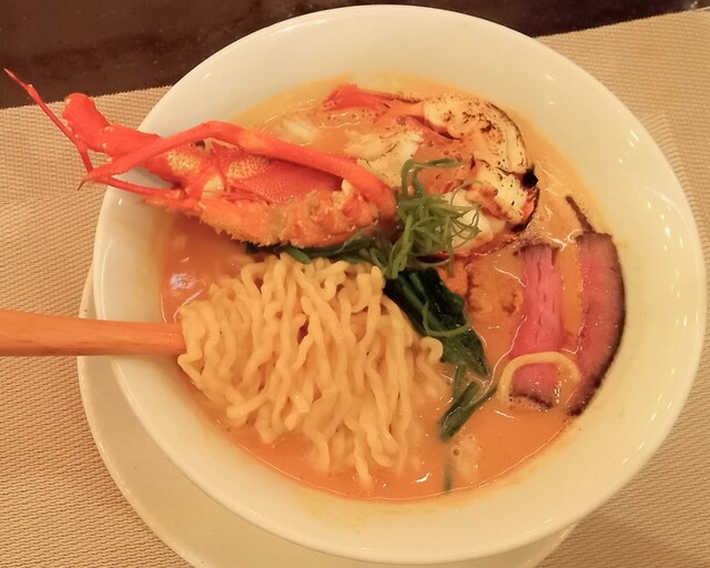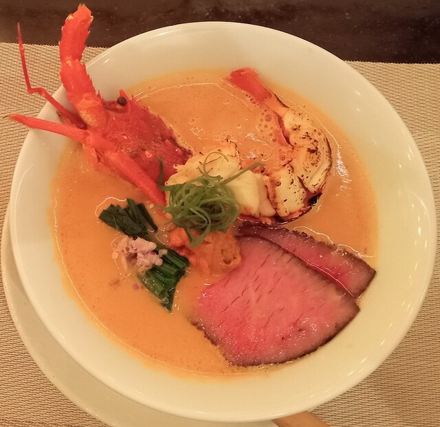 ロブスターの半身がドンと乗っている派手な見た目でそこに生雲丹とA5ランクの和牛ザブトンのチャーシューなどが添えられている。