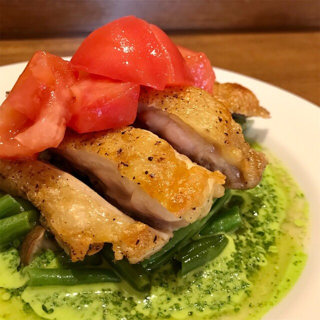 ■若鶏のロースト、フレッシュトマトとエスカルゴバターソース