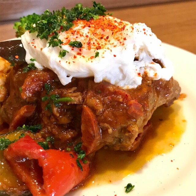■バスク風若鶏のトマト煮込み、ポーチドエッグ添え