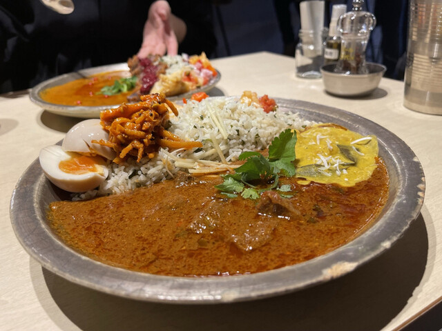 シナモン香る牛タンカレー &カボチャのパリップ合盛り 1400円 ( + スパイスタマゴ 100円 +ヤゲン軟骨のアチャール 200円)