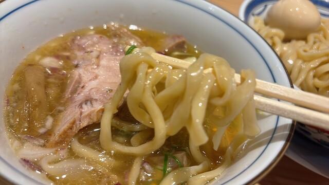 塩つけ麺のつけ汁はそのままではしょっぱいですが、太麺を潜らせて食べるとちょうど良く、鶏と小麦の風味がうまく調和して深みを増します。