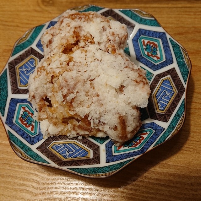 食べてみると文句なく旨い。白い衣がズボンの上にぱらぱら落ちてくるのが難ですが、衣は程よくクリスピー。中の鶏肉はしっとりして良く味が染みています。ビールを用意していないのが惜しまれる美味しさでした。