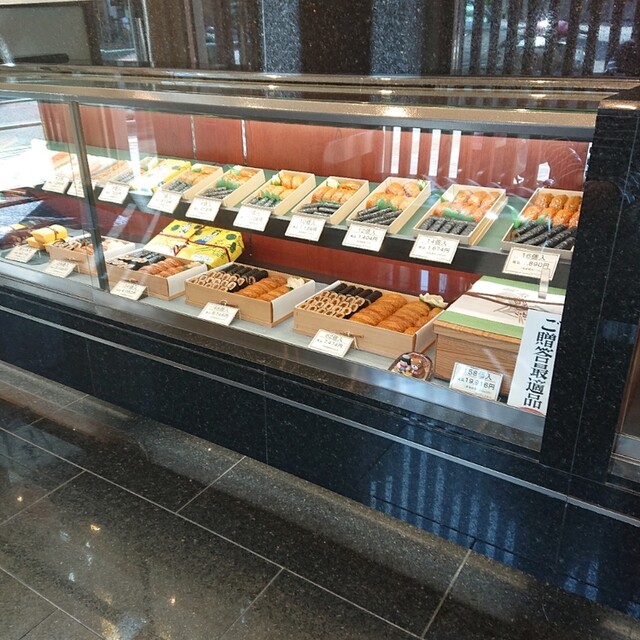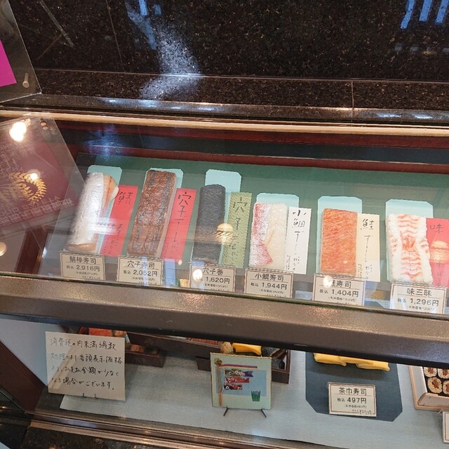 時間にもよるのかもしれませんが、巻き寿司はショーケースの上に長いまま積んであるものを注文を受けてから切って詰め合わせてくれます。
