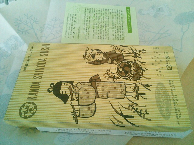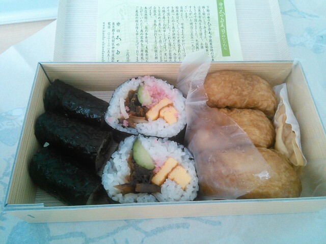 今回は駿河台の山の上ホテルに泊まった翌日、家で食べる昼食を買いに伺いました。買ったものは二種類で、一つはいなり、太巻き、干瓢巻き、たくわん巻き、かっぱ巻きが入った五色詰め合わせ1500円弱。