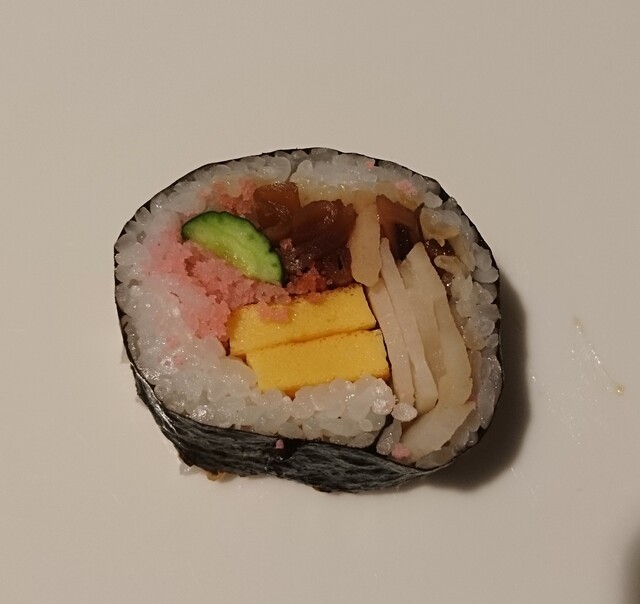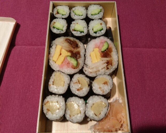 家に帰ってから開封すると、やはりいつも安定の美味しさです。太巻は断面の綺麗さが別格。ワタ抜きのかっぱ巻きはきゅうりのしゃきしゃきした食感と爽やかな風味がいい。お新香巻きのたくわんは噛んだ時の音が相変わらず。干瓢巻きはじっくり染みた甘辛の味付けが旨い。