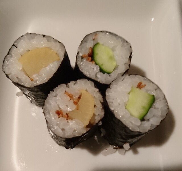 ちゃんとワタを取ったきゅうりを使ったかっぱ巻きも、薄切りの酢漬けレンコンを何枚も重ねたものが入った太巻きもシャリシャリ、しゃくしゃく、音と食感がいい。