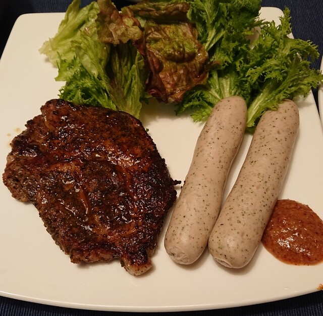 今回もヴァイスヴルストとグリルステーキ。特売のドイツビール「 アルピルスバッハ」の相性もばっちりです。