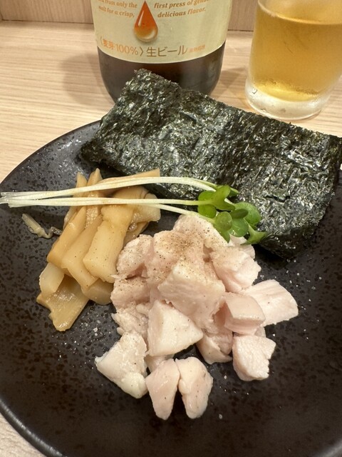 ビールにはおつまみがついていて、チャーシューの細切れに塩をふっているのとメンマと海苔とカイワレです。