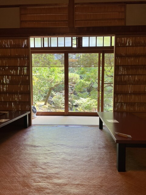 静寂に包まれ凛とした空気が漂う室内は、涼しい空気がゆっくり流れている。窓に写る日本庭園は気持ち良く、真後ろの窓には枯山水が広がる。窓から入る木漏れ日と建物の木の温もりが穏やかな気持ちにさせてくれる。ゆっくり流れる時の時間が心地よく思えました。