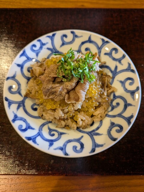 炊き込みご飯:舞茸の炊き込みごはんの上に熊肉とビワマスの卵がタップリのせられ薬味が添えてあります。美味しいに決まってるやつですネ!