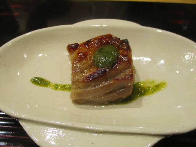焼物:こんがりと焼かれた塩釜の本鮪の味噌漬けの上に 綺麗なグリーンが印象的な木の芽味噌が添えられています。脂ののりが素晴らしいですネ!