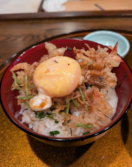 〆の御飯に、半熟玉子 150円(税別)の天ぷらを載せて「海老かき揚小丼」に変更して頂くのがお勧めです。