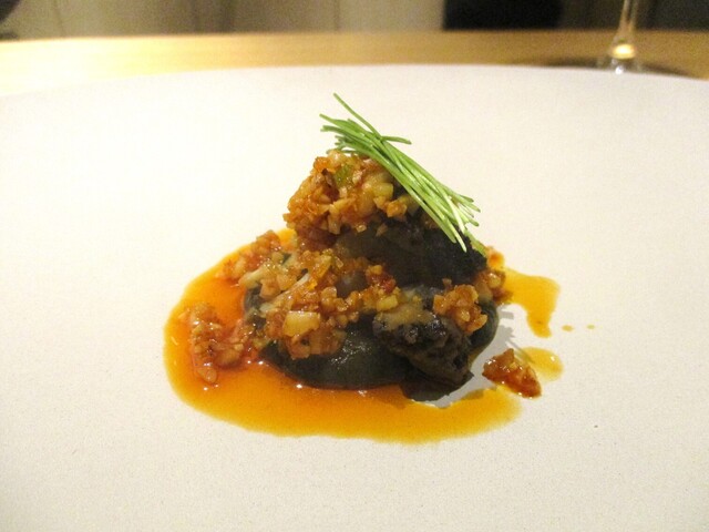 オマールエビ(カナダ)の身にウインタートリュフ(オーストラリア)を削ってあります。爪の部分には葱と山椒がトッピングされています。