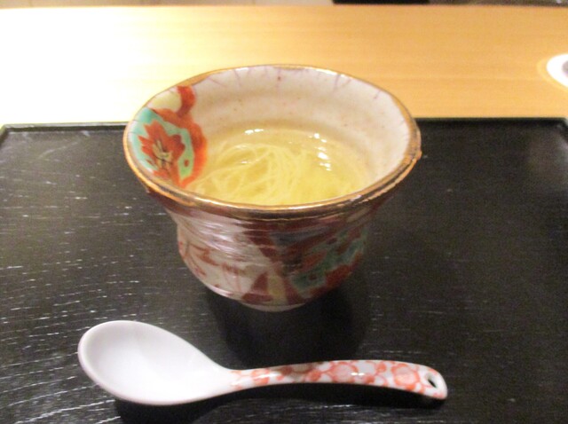 ◎ ラーメン:鶏胸肉と もも肉でとったダシの塩ラーメン。透き通ったやや黄色かかったスープは美しく、臭み無く、あっさりしているのに 味わい深いお味です。スープの中には麺のみで、ストレート麺がよく合っています。 みなさんスープを飲み干してみえました。 上海蟹のほぐし身と蟹味噌が小鉢で添えられていて、ラーメンに入れていただきました。