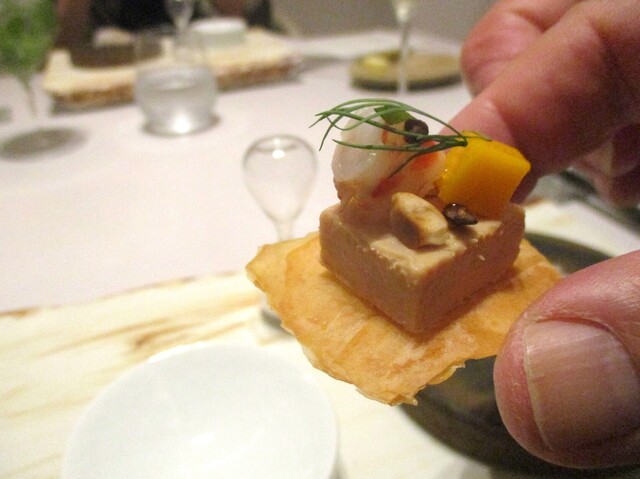 フォアグラ:フォアグラのテリーヌの下には板状にしたジャガイモのフリット、上には車海老、マンゴー、ナッツ etc.にフェンネルが飾られています。こちらも手に取っていただきます。 70秒分の白い砂が入った砂時計と共に お料理は提供されます。フォアグラの濃厚な味わいを砂時計の砂が落ちきるまで楽しみます。 そして・・・、余韻を残しつつ 次のお料理をいただきます。