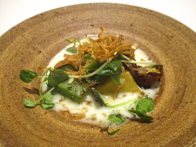 ◎ サスエ:静岡県焼津に在る 日本一美味しく魚を仕立てると多くの料理人たちから評価の高いサスエ 前田から仕入れた金目鯛が 鱗を付けた状態で 脂ののりがよくフンワリと仕上げられています。上には超薄切り神戸牛の生ハム、下には冬瓜のすり流しが敷かれ、キノコとムカゴが添えられており、深いグリーンが美しいシブレットのソースでいただきます。